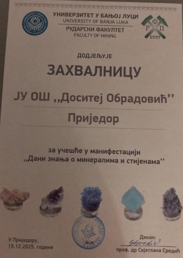 Ученици наше школе учествовали су на манифестацији „Дани знања о минералима и стијенама“, која је одржана у организацији Универзитета у Бањој Луци. Манифестација и квиз одржани су у просторијама Рударског факултета у Приједору.