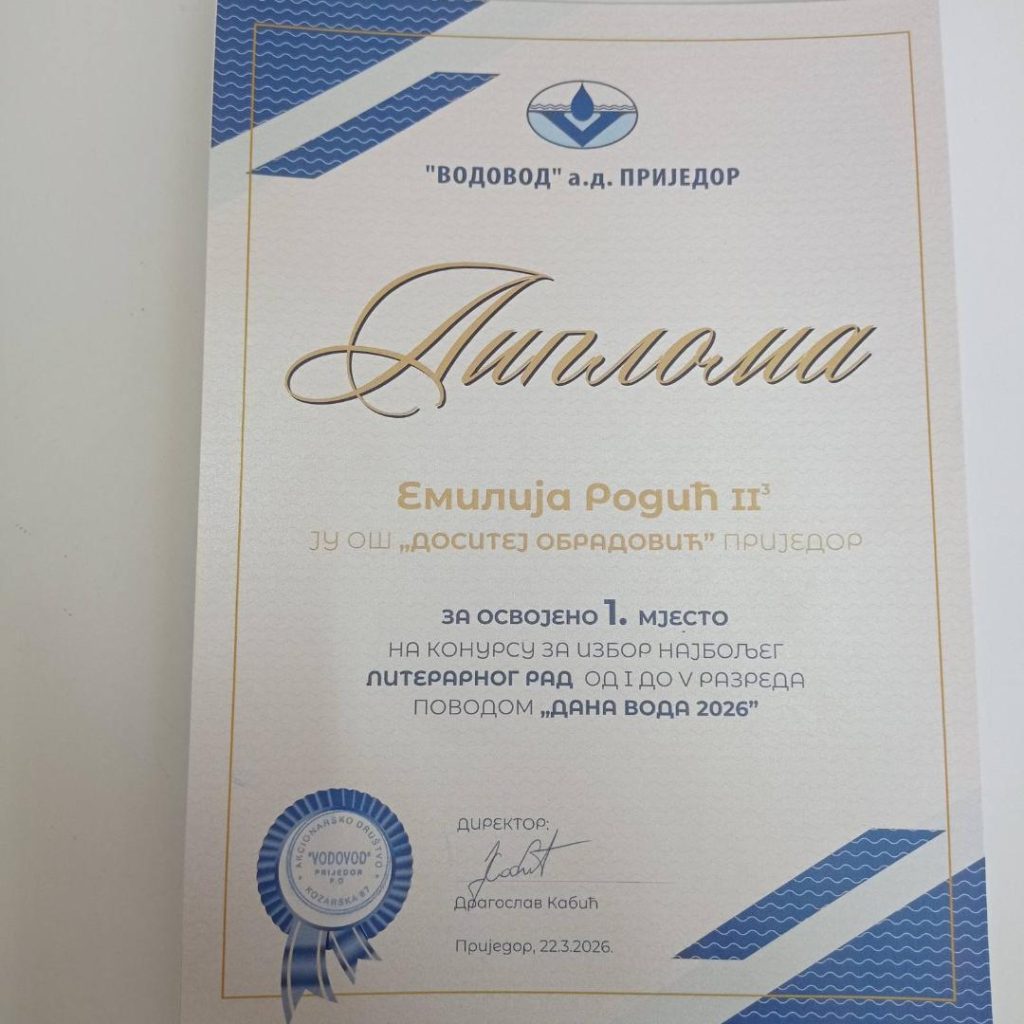 Поводом обиљежавања Свјетског дана вода Водовод а. д. Приједор сваке године расписује ликовни и литерарни конкурс на тему ,,Вода“. Ове године тема конкурса била је ,,Вода је извор живота“. У просторијама Водовода уприличена је подјела диплома, награда и захвалница учесницима ликовног и литерарног конкурса. На овом конкурсу наша ученица Емилија Родић (други разред) освојила је ПРВО мјесто за литерарни рад у категорији од првог до петог разреда, а Сара Ступар ДРУГО мјесто у категорији од шестог до деветог разреда. Свим учесницима подијељене су захвалнице и пригодни поклони. Честитамо нашим ученицама!